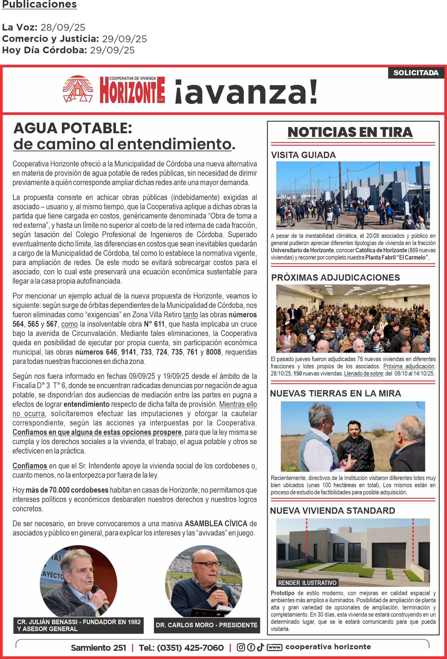 Por mencionar un ejemplo actual de la nueva propuesta de Horizonte, veamos lo siguiente: según surge de órbitas dependientes de la Municipalidad de Córdoba, nos fueron eliminadas como “exigencias” en Zona Villa Retiro tanto las obras números 564, 565 y 567, como la insolventable obra N° 611, que hasta implicaba un cruce bajo la avenida de Circunvalación. Mediante tales eliminaciones, la Cooperativa queda en posibilidad de ejecutar por propia cuenta, sin participación económica municipal, las obras números 646, 9141, 733, 724, 735, 761 y 8008, requeridas para todas nuestras fracciones en dicha zona.