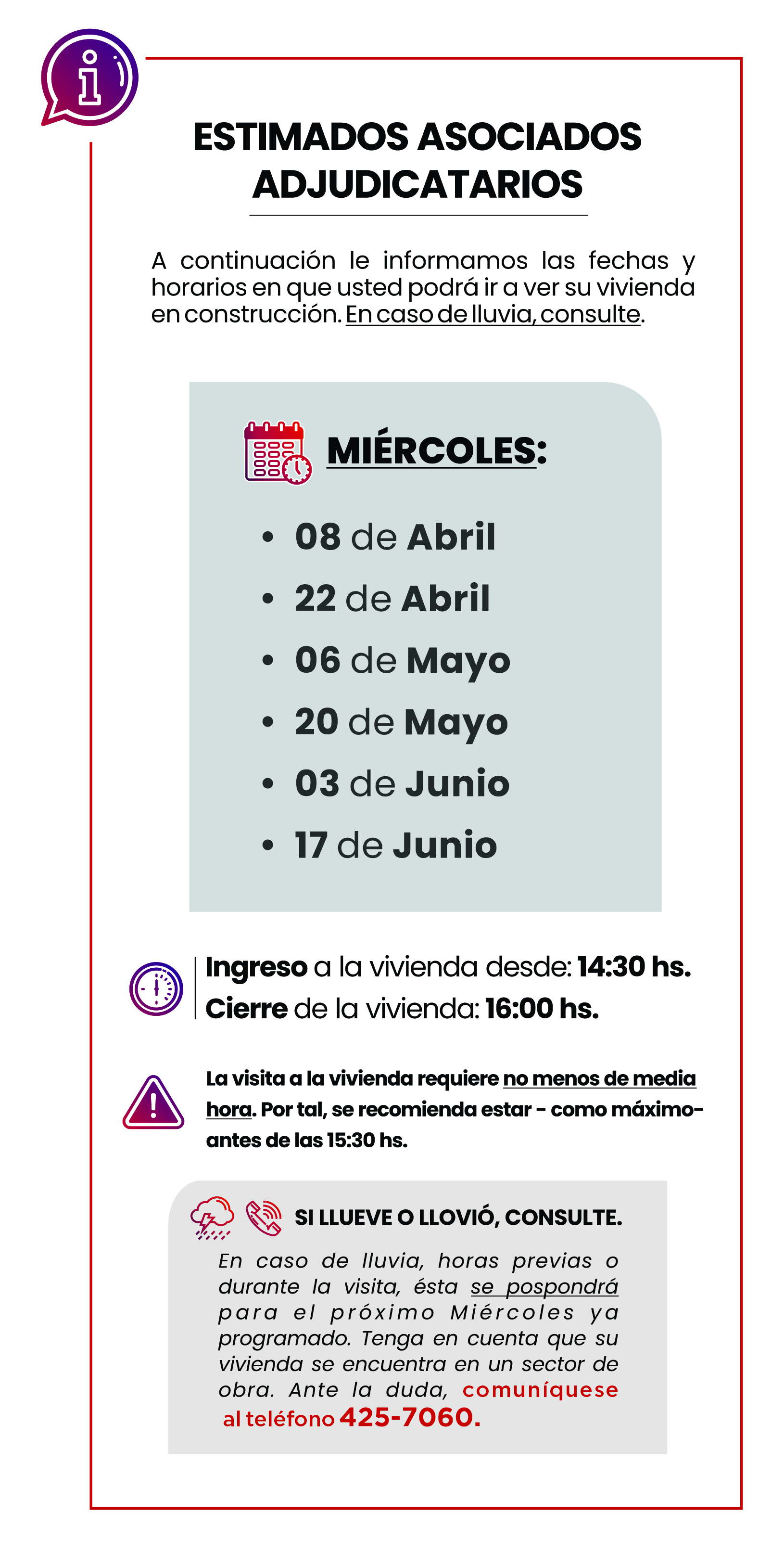 4- Acto de Adjudicación presencial: la adjudicación se llevará a cabo el día miércoles 29 de Abril en diferentes horarios, según sean Asociados individuales, Asociados Operadores, Asociados pertenecientes a Convenios, Asociados presentantes a viviendas a construir o construidas, etc. Cabe aclarar que, al momento del Llenado de Sobre para adjudicación, se le indicará a cada Asociado participante el horario a concurrir a dicho acto.