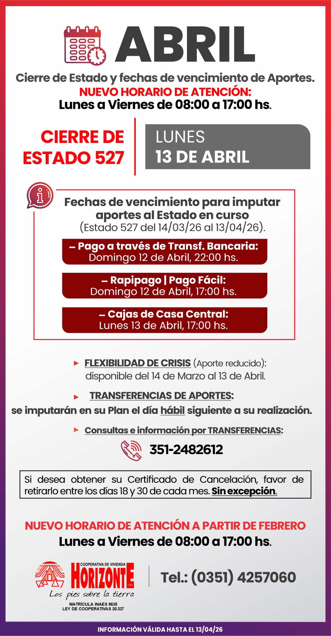 – Los Asociados deberán tener al día los aportes de Gastos Cooperativos y de Ofertas de Adjudicación anteriores, antes de la fecha del Acto de Adjudicación. Fecha tope de Aporte: jueves 16 de Abril (sólo para Asociados presentantes en adjudicación).