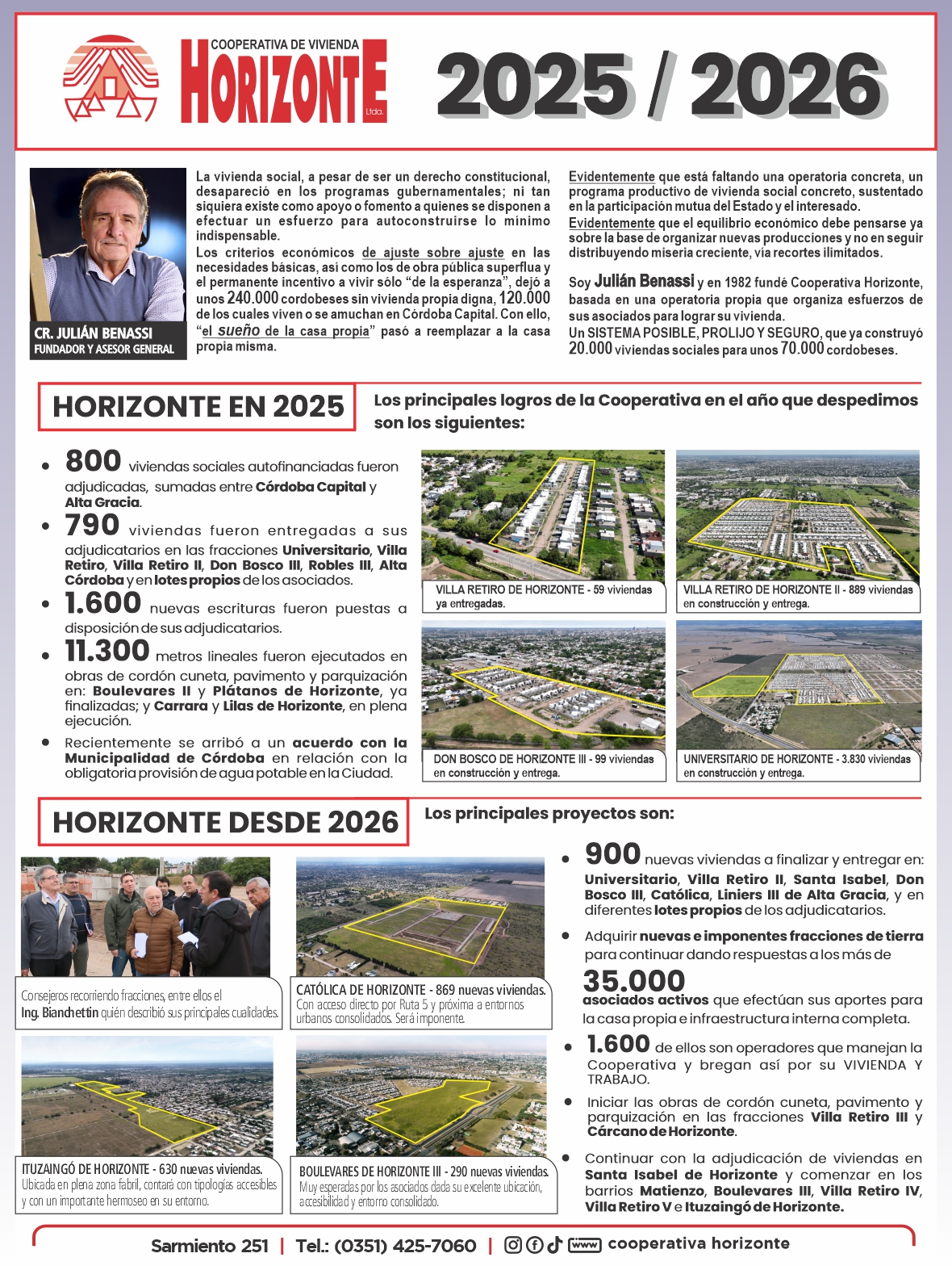 Soy Julián Benassi y en 1982 fundé Cooperativa Horizonte, basada en una operatoria propia que organiza esfuerzos de sus asociados para lograr su vivienda.