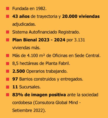 Durante los primeros cinco años, se logró construir un centenar de viviendas. En la actualidad celebra su 43º Aniversario con 20.000 viviendas adjudicadas + un Segundo Plan Bienal por 3.131 viviendas más. Los Adjudicatarios son gente de trabajo, oficios y profesiones que no tienen cabida en la propuesta privada ni en los planes oficiales.