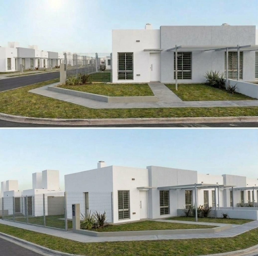 Esta nueva tipología cuenta con similar superficie construida a la tradicional vivienda Compacta “E” entre medianeras, mantiene sus terminaciones y diseño y posee muro portante propio hasta un futuro segundo dormitorio.